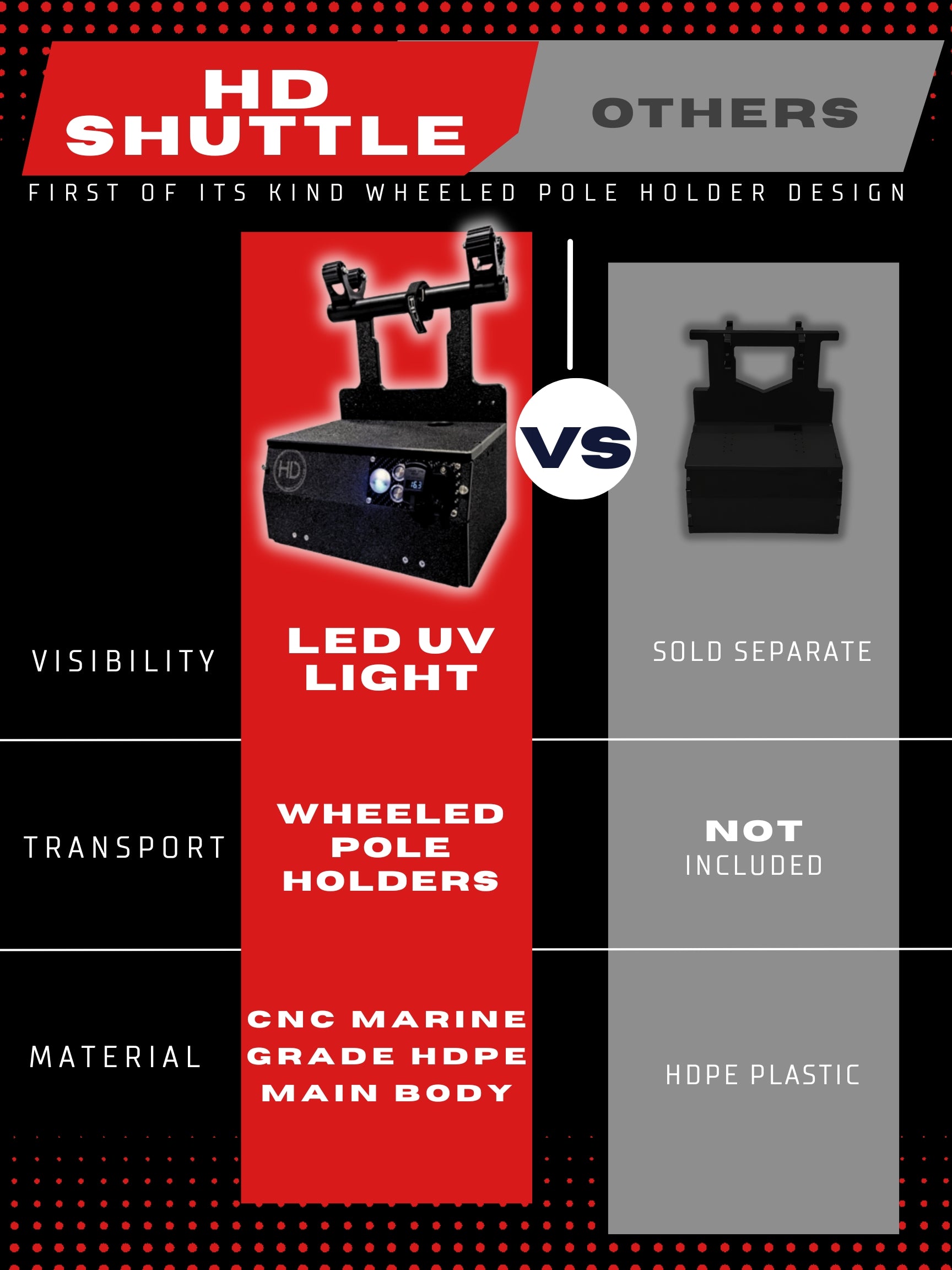Née d'années d'expérience sur l'eau et la glace, la navette HDI intègre les dernières innovations en matière de sonar portable. Usinée CNC à partir d'un véritable PEHD de qualité marine résistant aux UV, cette navette est conçue pour durer. Vous ne trouverez pas une seule pièce imprimée en 3D !